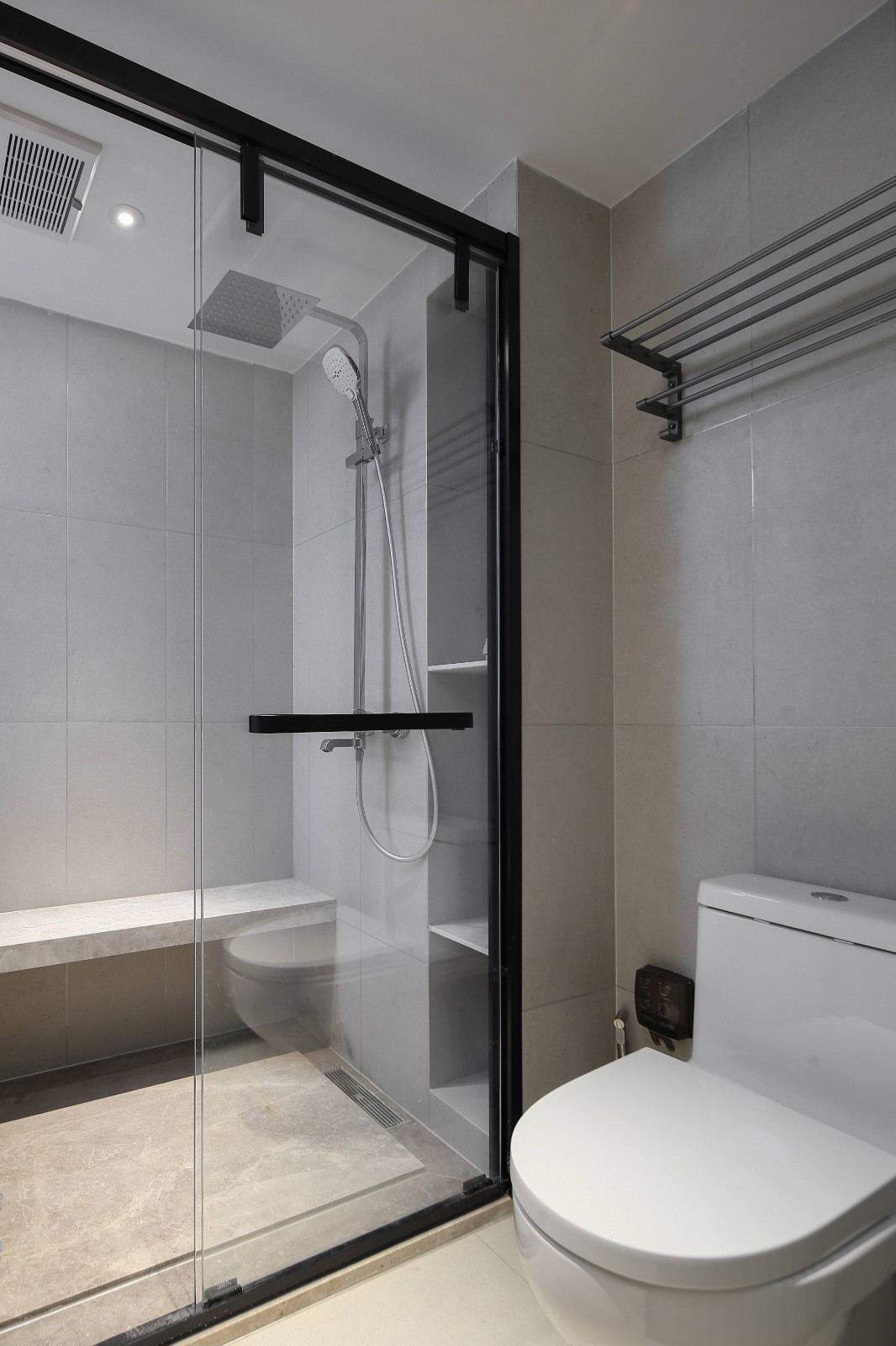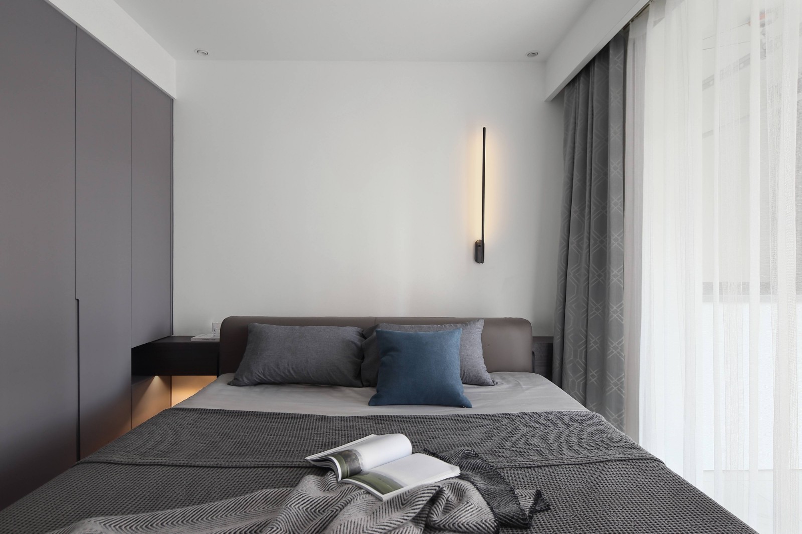 門后墻體的外凸實現(xiàn)了主臥衛(wèi)生間的干濕分離,讓難以利用的角落發(fā)揮作用,補充功能,產生的便捷與幸福感往往更甚。 主臥睡眠區(qū)的開間并不寬敞,為了解決功能性的問題,將床頭柜與衣柜作為一個整體來設計,體塊的連結穿插不僅滿足多種功能需求,配合燈光的使用,在臥室灰度的和諧色調中延續(xù)出輕靈和溫情的層次。