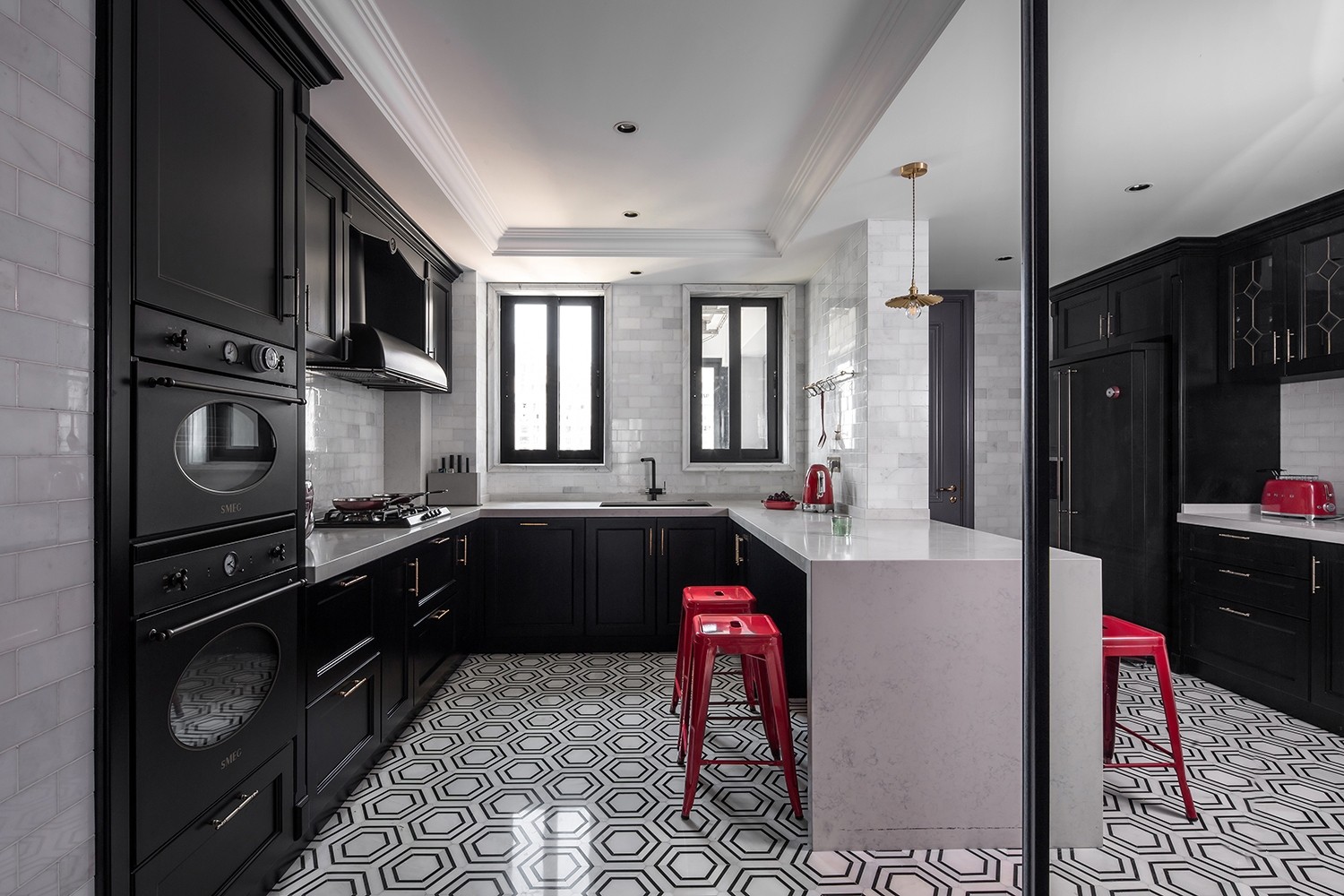 利用透明的推拉門作為廚房與餐廳的分隔,廚房內(nèi)精致的黑色櫥柜與強烈?guī)缀螆D案地磚,紅色家具與電器點綴其中,營造出豐富的視覺感受。