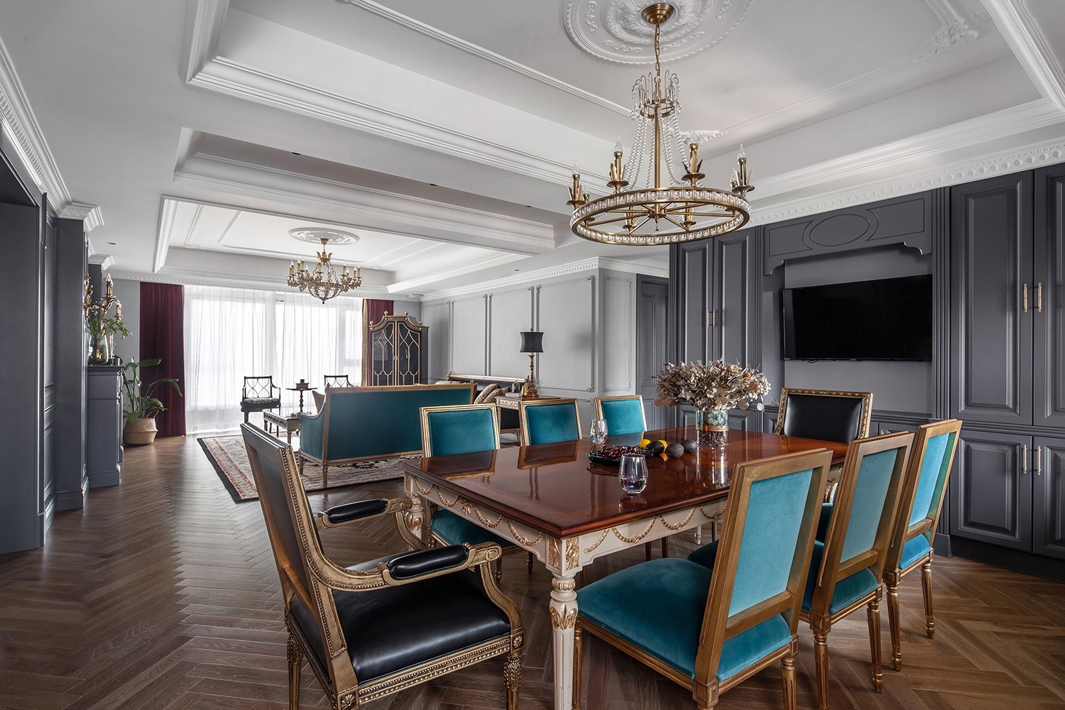設(shè)計師精心的挑選了室內(nèi)的每一件家飾,人字形拼貼的木質(zhì)地板與灰色墻面上精致的石膏線花紋,營造出復(fù)古且華麗的空間氛圍