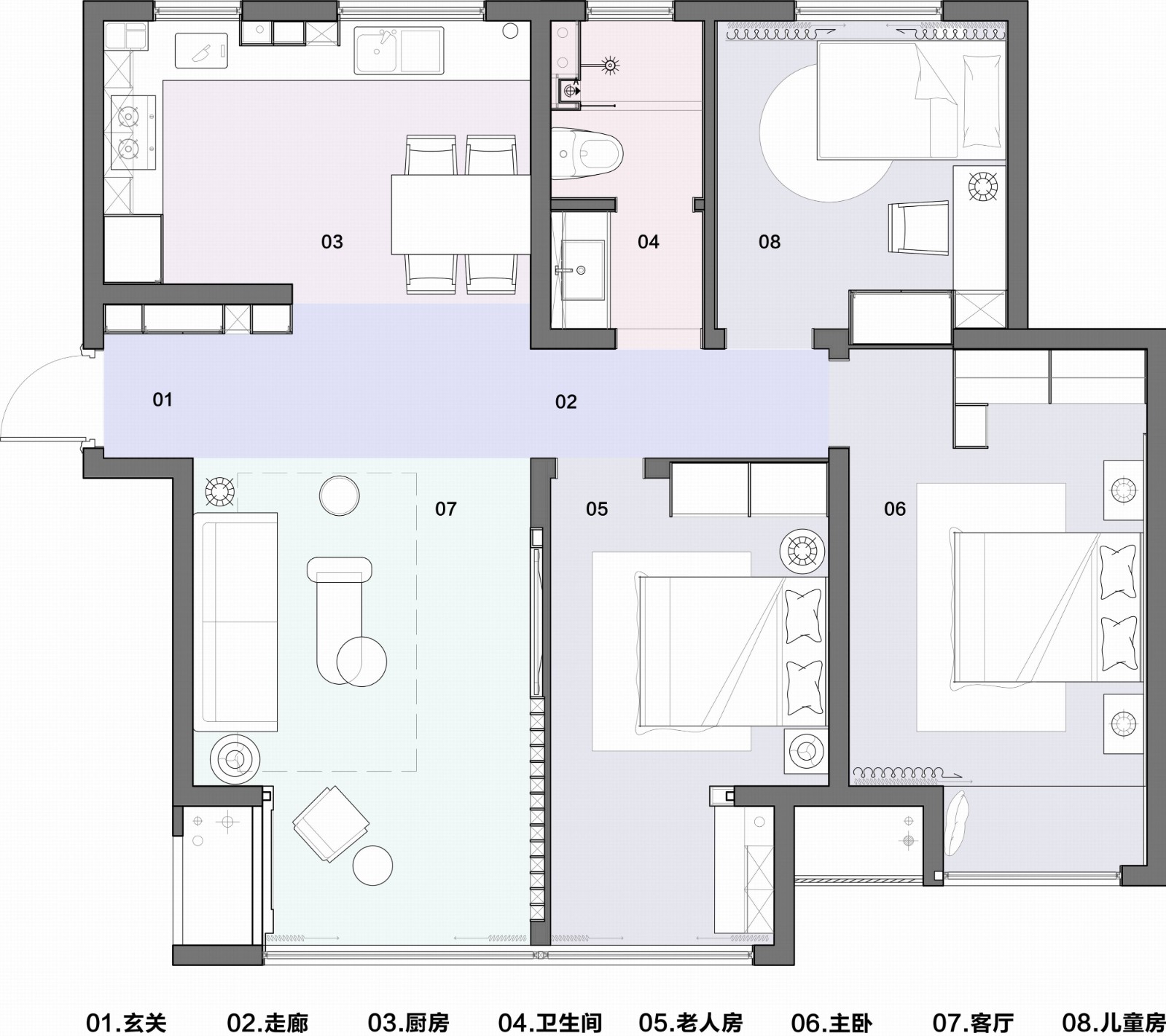 將客廳與陽(yáng)臺(tái)之間墻體拆除,歸于一體,擴(kuò)大空間面積。整面墻的落地窗將光線引入室內(nèi),使得整個(gè)空間更加明亮通透。