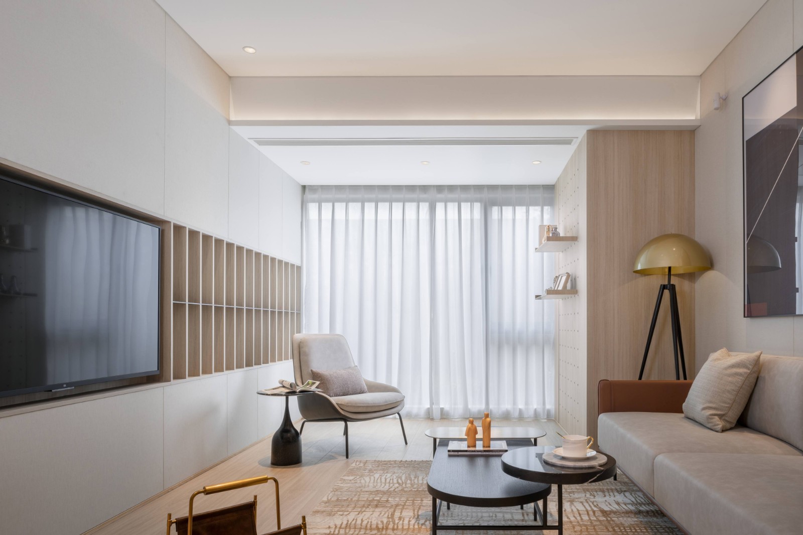 電視背景墻做為空間的點(diǎn)睛之筆,木色格子錯(cuò)落有致地延伸開(kāi)來(lái),充滿藝術(shù)的遐想,同時(shí)又使空間具有延展性。