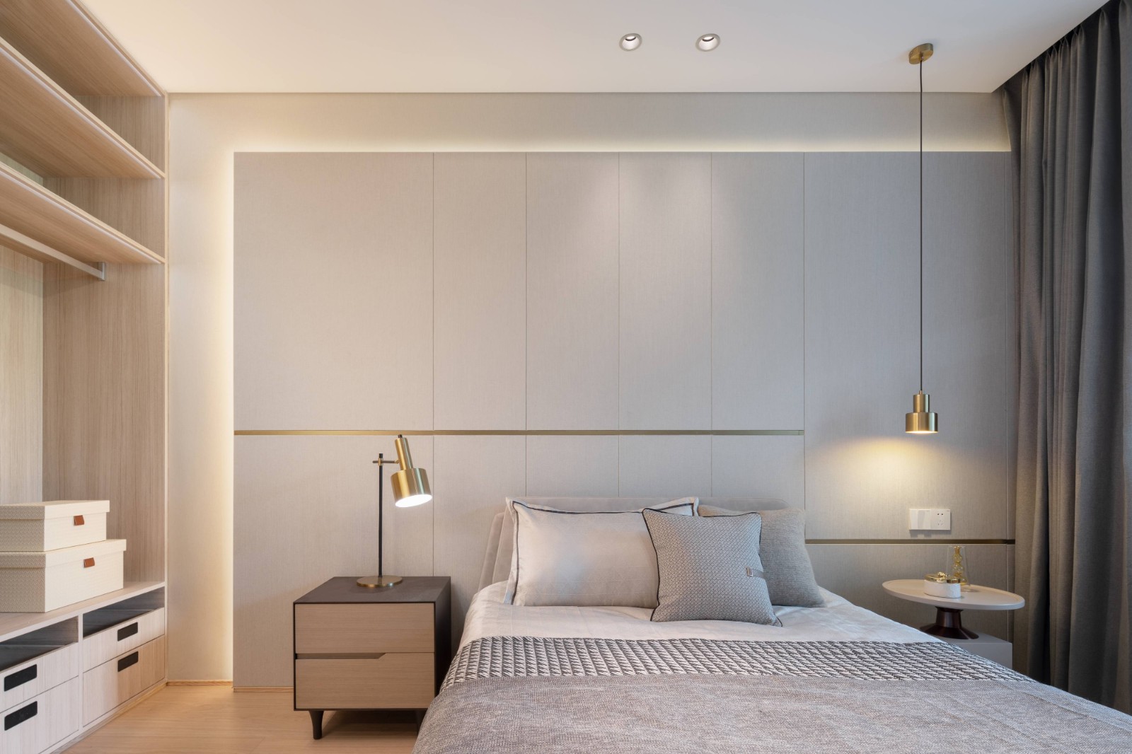 主臥室延續(xù)客廳的風(fēng)格,以灰色墻體為主背景,木色格子做為修飾,簡(jiǎn)約但不失大氣。床頭柜打破傳統(tǒng)模式,采用兩個(gè)造型不同的模式,更為靈動(dòng)。