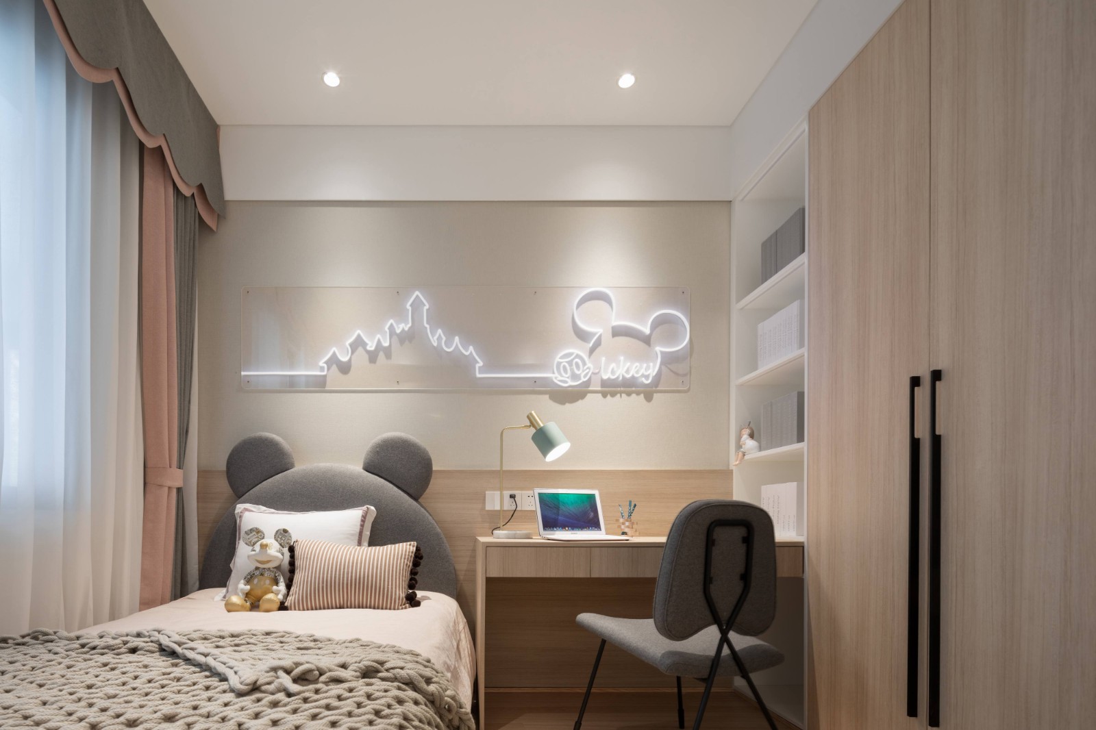 兒童房衣柜與書(shū)柜結(jié)合為一體。墻面運(yùn)用米奇輪廓,增添童趣,并與床頭造型相呼應(yīng),突出主題性。寬敞的書(shū)桌,讓孩子在愉悅的環(huán)境中學(xué)習(xí)。