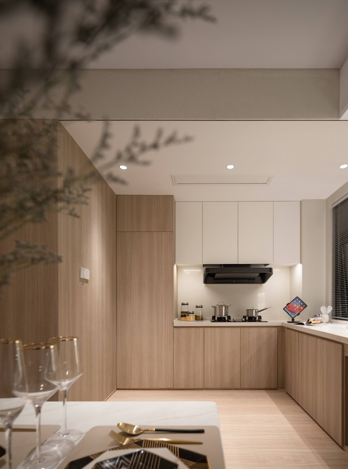 木色櫥柜跟墻面連成一體,讓空間更開(kāi)闊