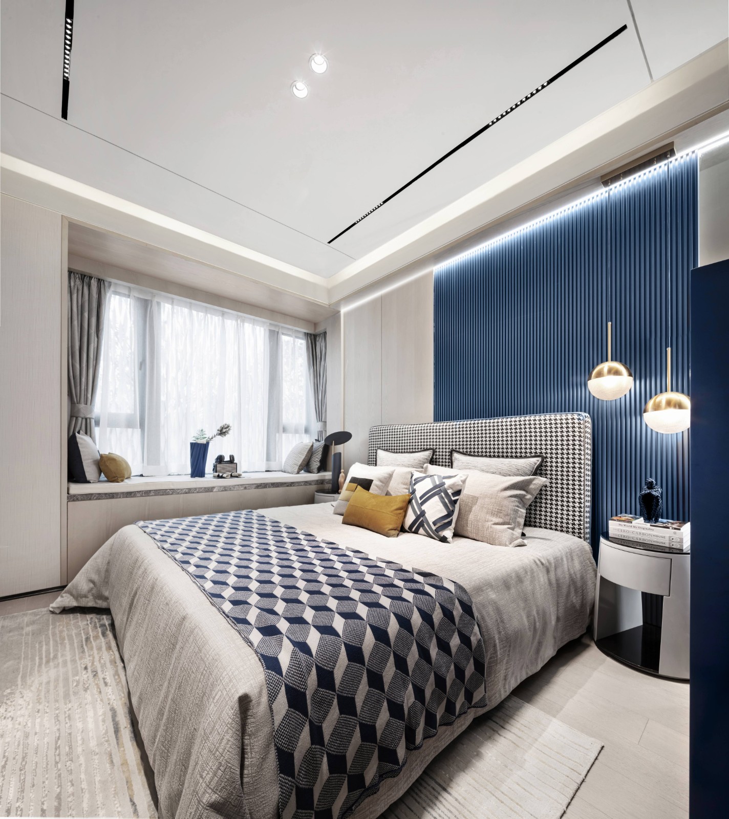 主臥沿襲空間主題色,藍色格柵與原木木飾面相輔相成,側(cè)邊鏡面設(shè)計在視覺上將空間延伸。頂面內(nèi)嵌式燈帶加深了臥室空間的體塊感;軟裝以活躍的亮橙作為配色,展示出的是當代年輕人不拘一格的個性。