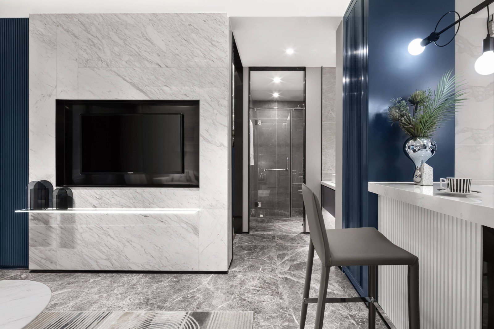 嵌入式電視機與墻面融為一體,透明樹脂板代替?zhèn)鹘y(tǒng)電視機柜的設(shè)計,在空間中增加一絲通透。繁忙的生活結(jié)束后,慵懶的躺在沙發(fā)之中,打開電視觀看天下趣聞,享受當代生活的美好。