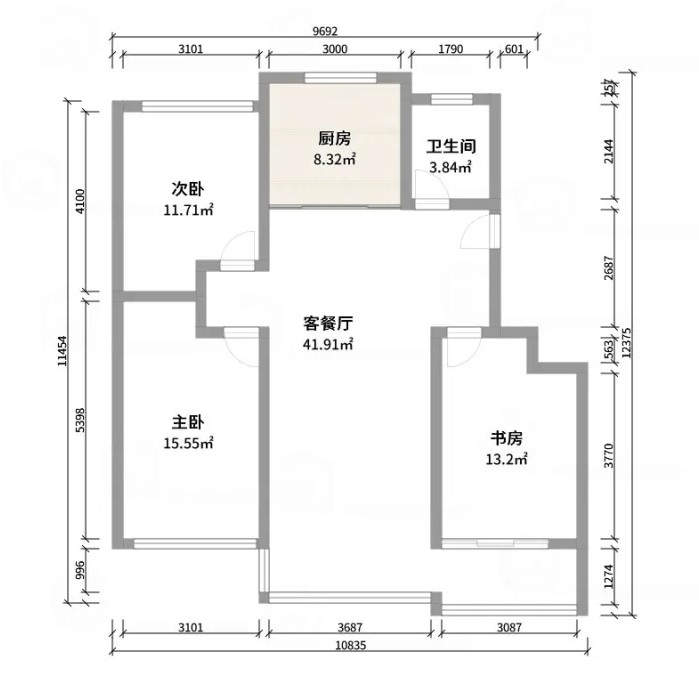 戶型為三室一廳一廚一衛(wèi)一陽臺,客廳較大,作為客餐廳;書房可作為多功能室;陽臺位于書房位置,晾曬衣物比較隱蔽。