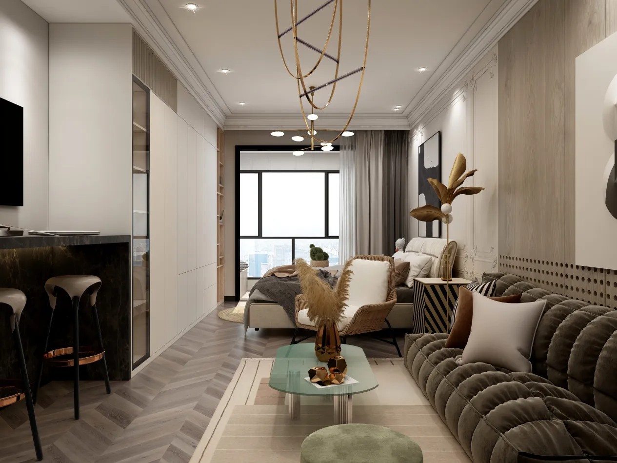 本方案為50平公寓設計方案,整體色調以暖意的奶咖色為空間的色調走向,搭配上不同的輔色如亮橙色與清爽的薄荷綠作為點綴。硬裝上護墻板的不同搭配設計,空間上運用不同的色塊!