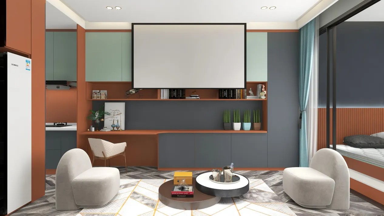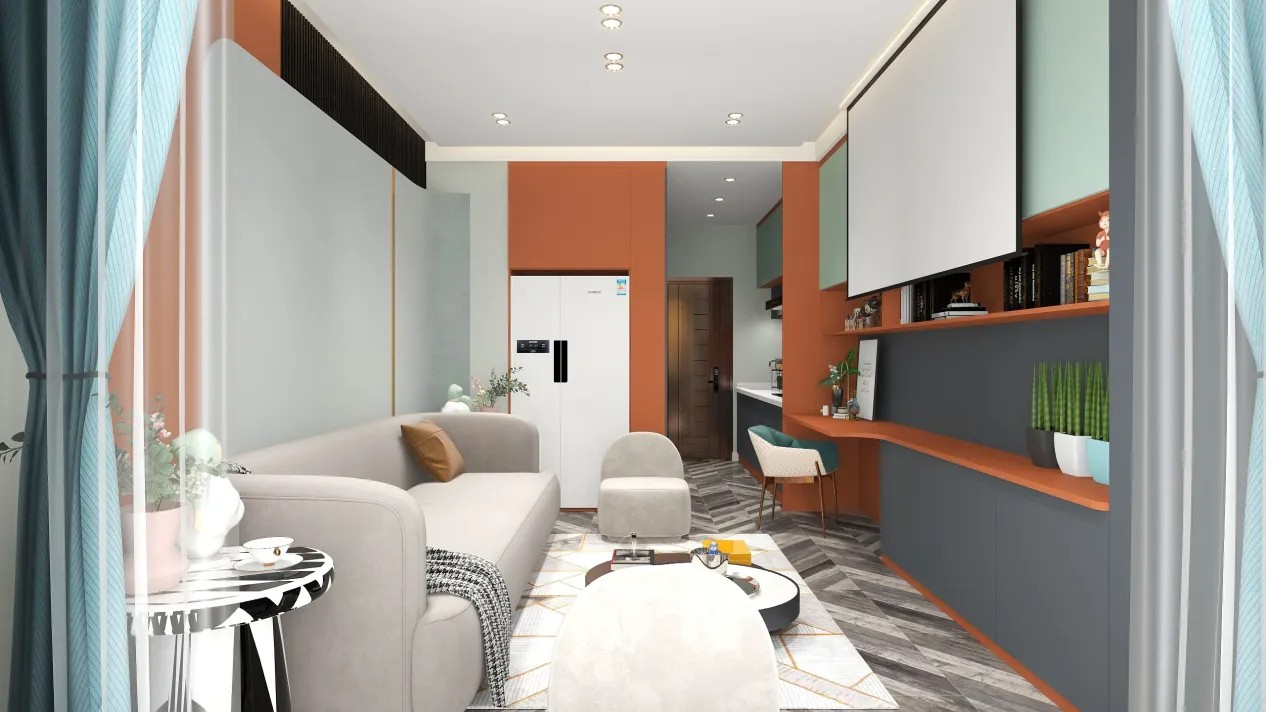 整個空間橙色灰色為主,用灰色綠色進行搭配點綴,再在簡單明了的色彩空間里,也注重實用性功能性。