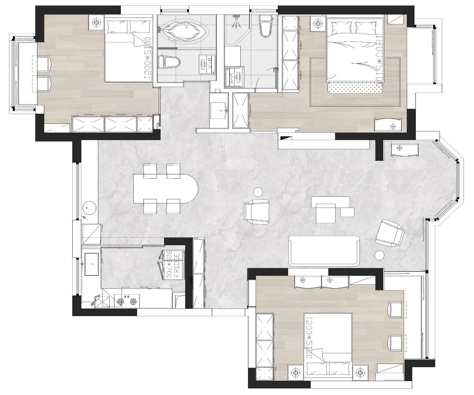 餐廳西廚增加廚房功能,定制的餐桌,圓邊與直角邊依據現(xiàn)場餐廳尺寸定奪。餐桌的造型又于客廳環(huán)境相和諧!