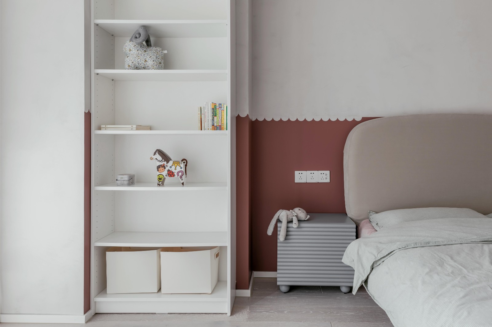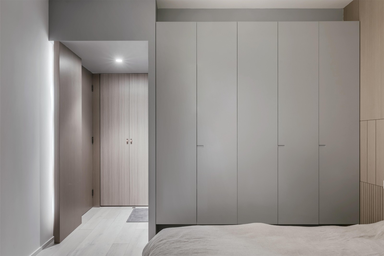 主臥床靠的墻面是藝術涂裝與木紋板的拼接相聯(lián)系 ,泥塑的裝置與藍色布藝床頭柔軟地與他們相遇。