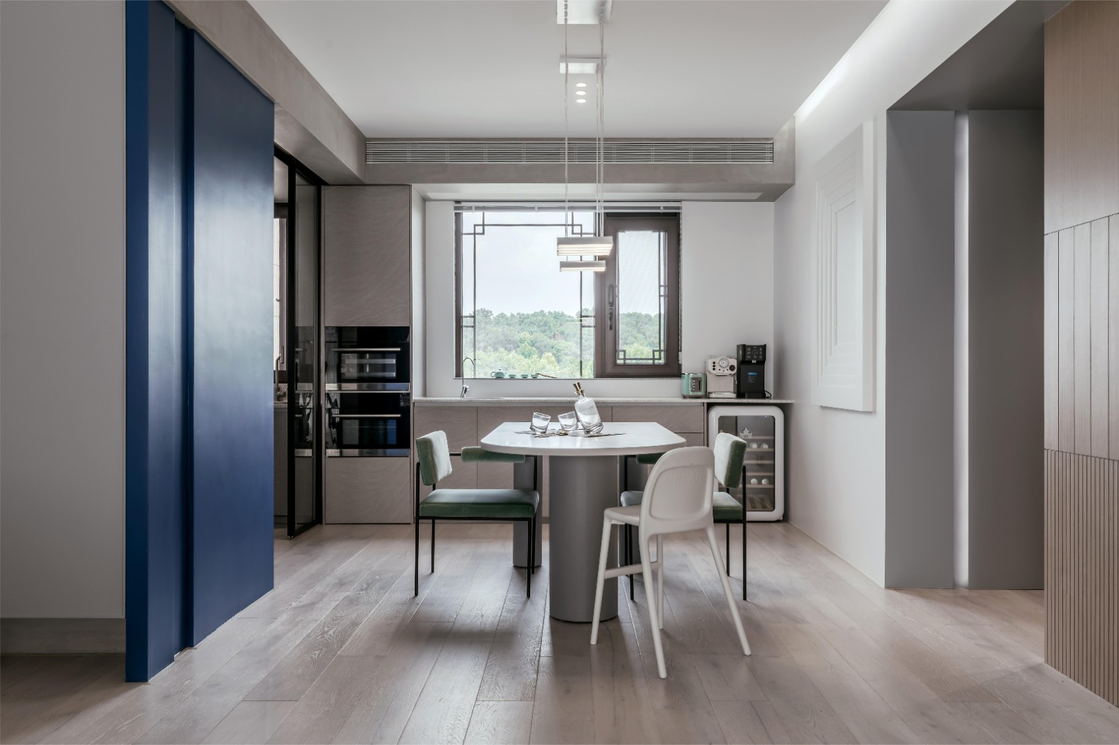 廚房采用大的推拉門,保證了廚房和餐廳的采光,讓空間感更加寬敞