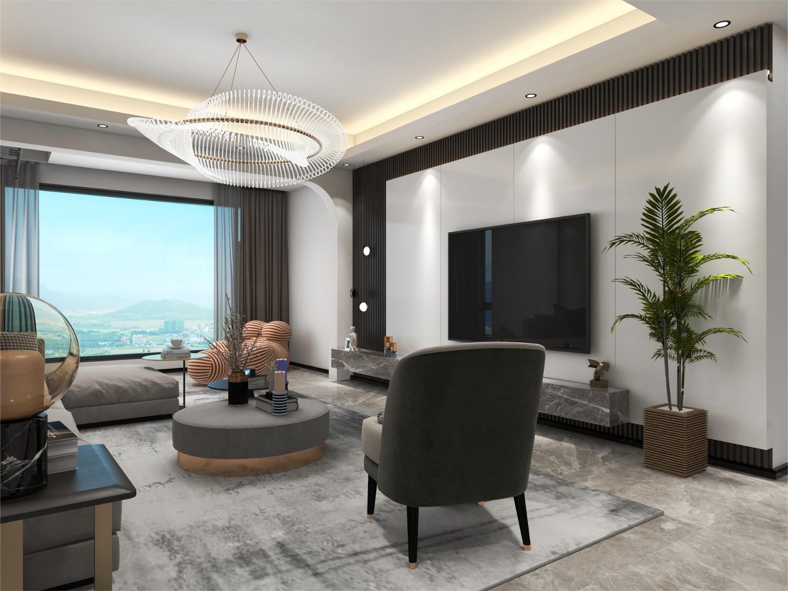 寬整的空廳,空間感十足,環(huán)型燈池讓晚上的氛圍感十足
