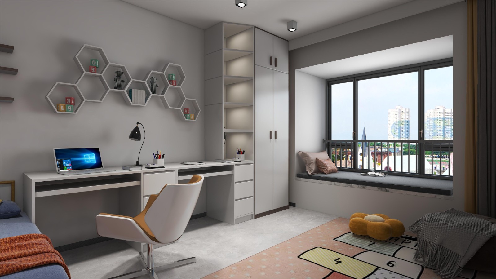 客廳的空間利用,兩段式書桌,供兩個(gè)孩子學(xué)習(xí)使用,剩余為玩??臻g