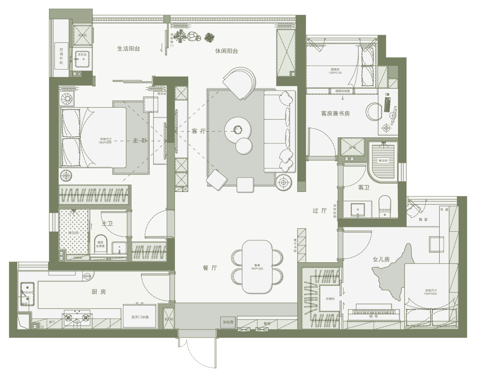 本案業(yè)主為三口之家,是業(yè)主的改善住房,男女業(yè)主喜歡的風(fēng)格差異較大,女業(yè)主喜歡色彩靚麗并且充滿活力生機(jī)的家居空間,而男業(yè)主則喜歡極簡黑白灰冷峻的都市風(fēng),這兩種風(fēng)格很難融合,***我們商討出軟裝色系方面還是以女業(yè)主喜好為主,而硬裝呈現(xiàn)則結(jié)合現(xiàn)代簡約風(fēng)的設(shè)計(jì)手法,最終才有了這套綠意盎然的現(xiàn)代休閑風(fēng)作品…… 整體定位現(xiàn)代休閑,整屋***塊手法處理,原木色飾面板+3種綠色+藏藍(lán)色局部跳色。整屋人字拼地板磚、魚骨
