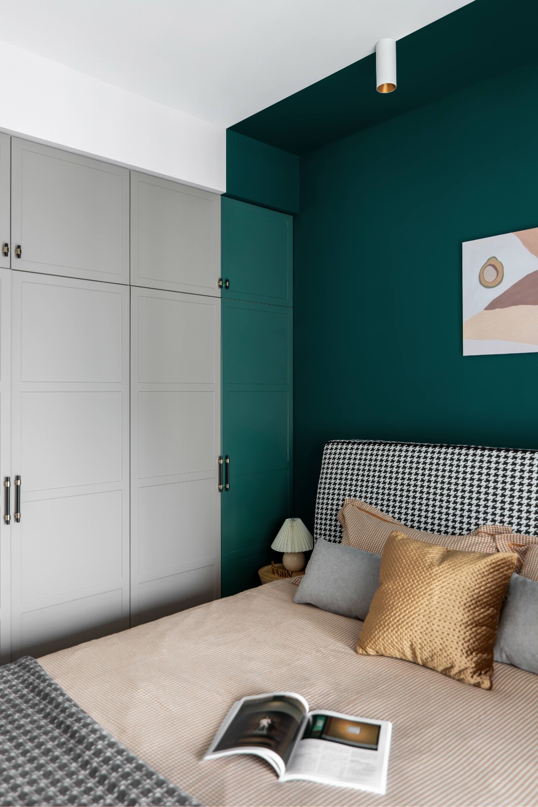 推開房門,深綠色映入眼簾,綠色從床背景蔓延至頂面、柜面