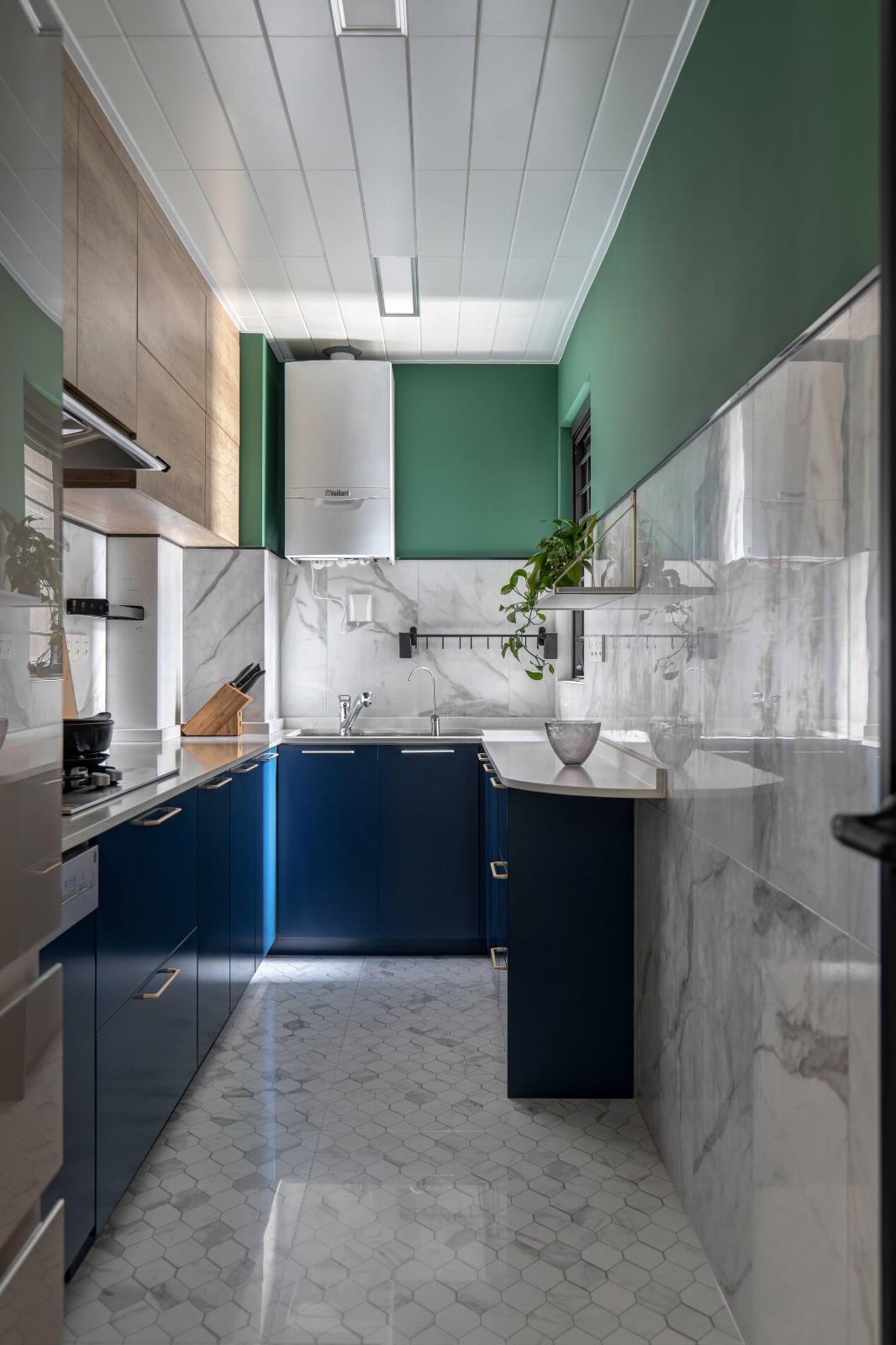 公共空間鋪設(shè)人字拼地板磚,跳躍的藍(lán)色餐邊柜,顏值與實(shí)用兼具