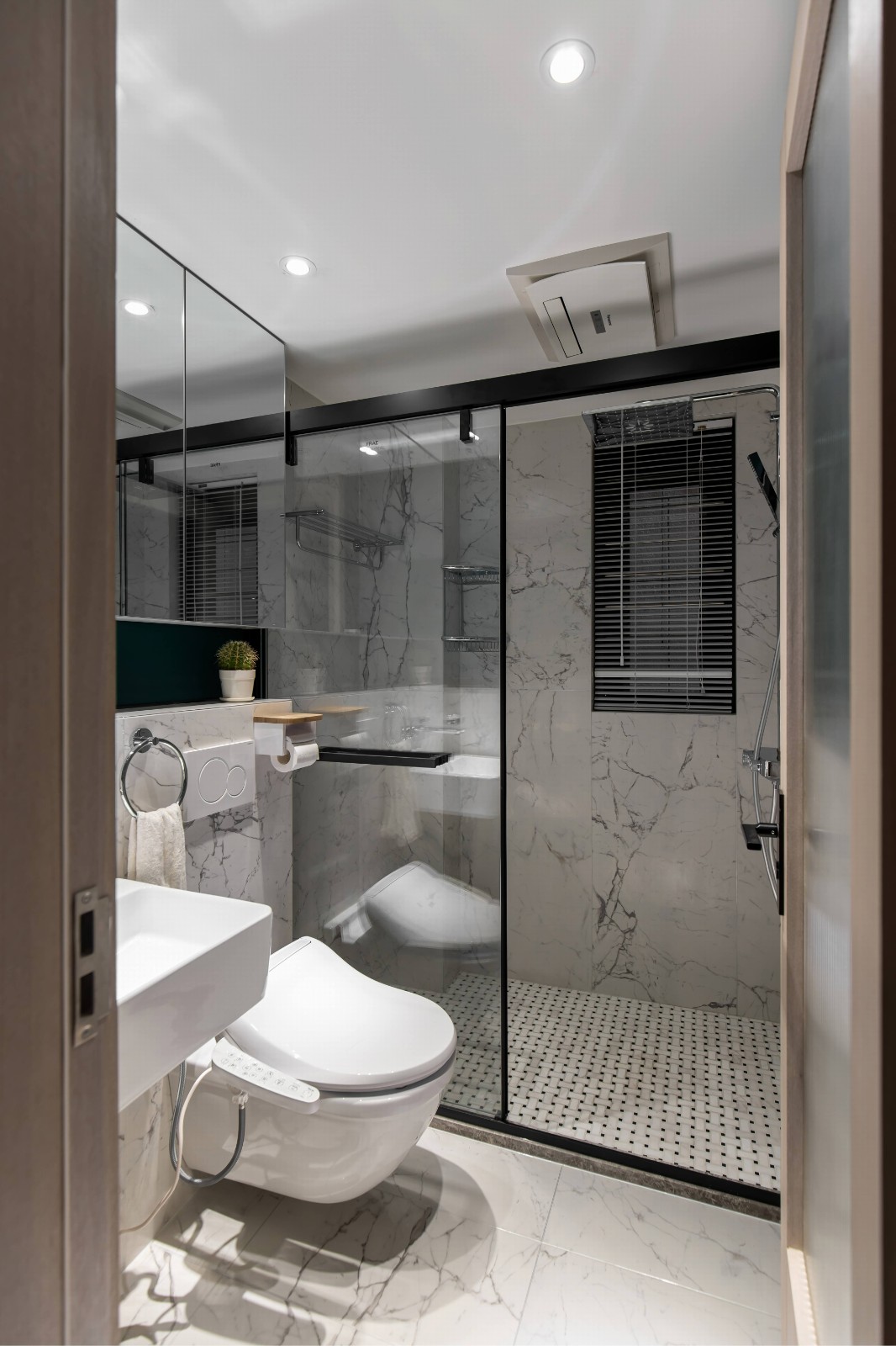 主衛(wèi)面積縮小,使用壁掛盆和墻排馬桶,多出的空間給主臥增加一組長衣柜