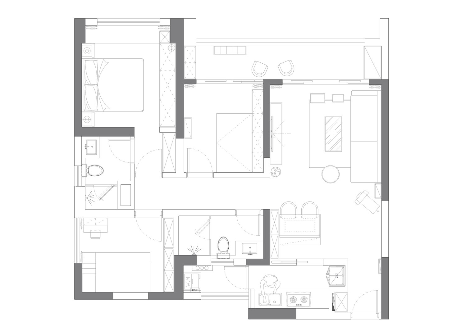 初次碰面,業(yè)主對(duì)于裝修風(fēng)格的要求是“和現(xiàn)有硬裝風(fēng)格一致且有設(shè)計(jì)感”,相信這也是很多精裝房業(yè)主的想法。不改動(dòng)原有硬裝,并在滿足儲(chǔ)物的基礎(chǔ)上實(shí)現(xiàn)空間的設(shè)計(jì)感,讓人有眼前一亮的感覺(jué),可以實(shí)現(xiàn)嗎?說(shuō)實(shí)話,只要溝通到位,并不難。 ?就像是這套案例,揣著隱約的文藝范兒,注入工業(yè)風(fēng)的元素,柔化了尖銳的邊角細(xì)節(jié),以精致與粗獷相結(jié)合的反差形式,揉合零星高明度顏色的沖擊,展現(xiàn)來(lái)自生活的美學(xué)。