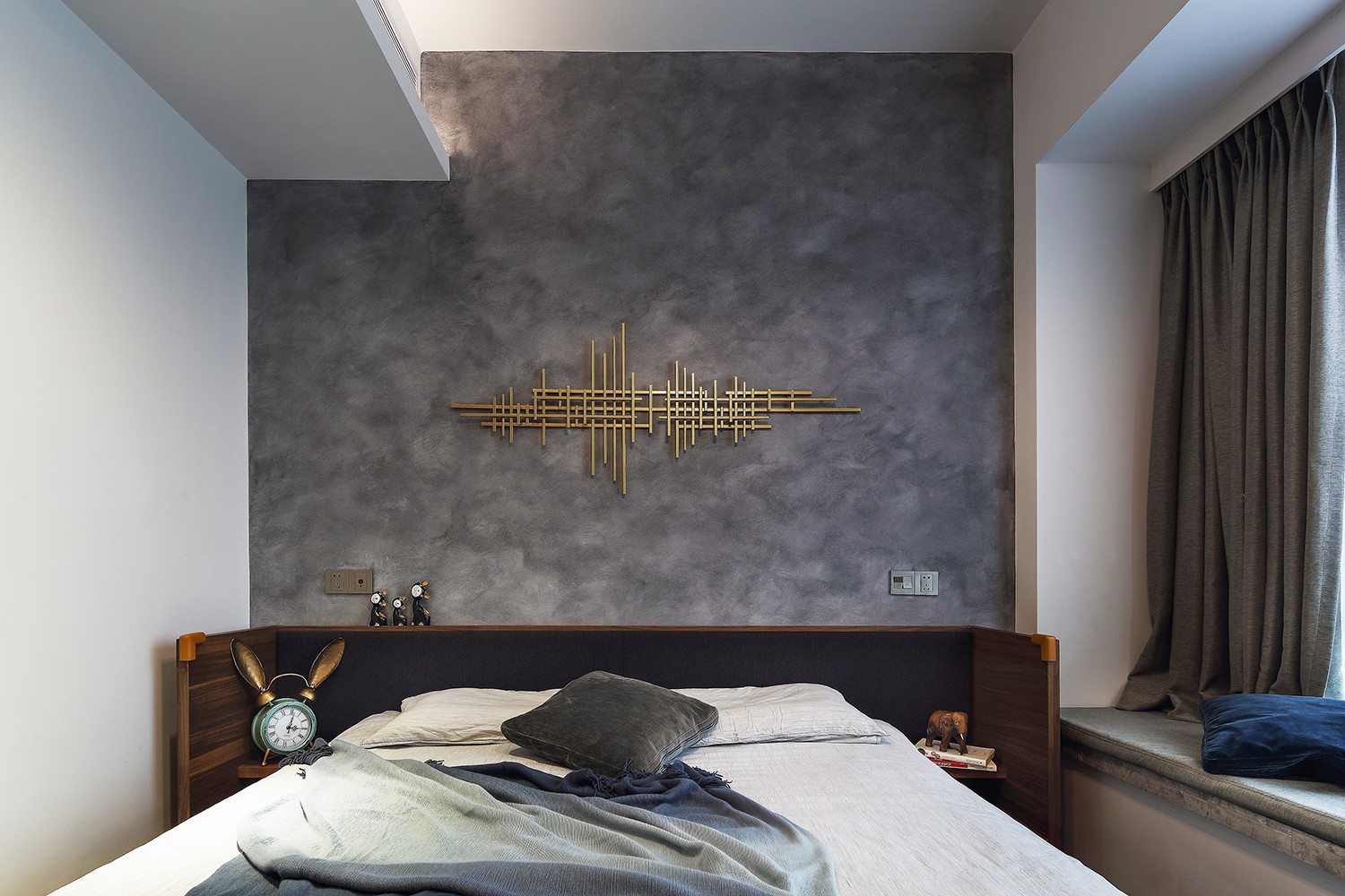 咖色窗簾與光線倒映出的光影、深木色地板與床頭柜的巧妙連接、主臥背景墻的霧氣似的灰度中閃出一抹金色,似***的悸動(dòng)……目光所及之處都是個(gè)性。