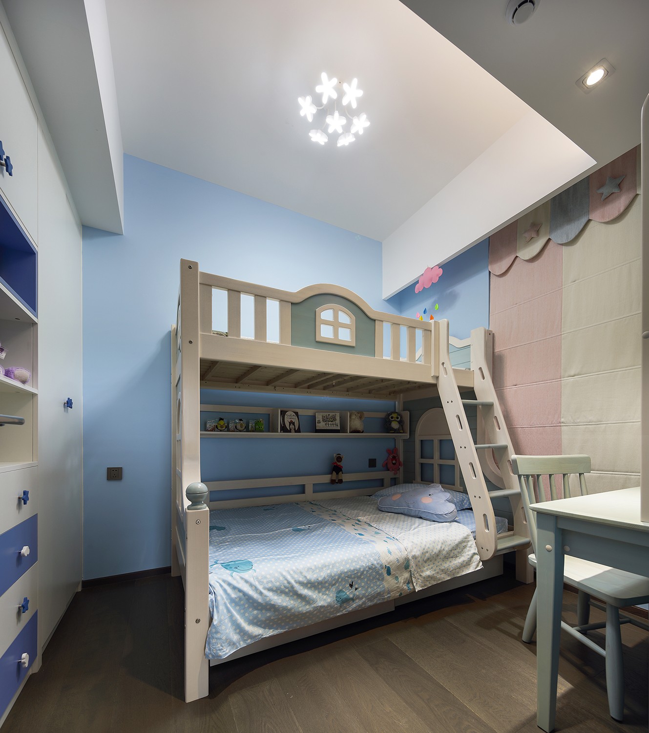 白云藍(lán)天,是自然的呼吸。上下床增加了小朋友的活動(dòng)空間,其造型也很童趣。淺色系的窗簾和書(shū)柜,為空間添上另一抹色彩,整個(gè)空間變得很和諧。