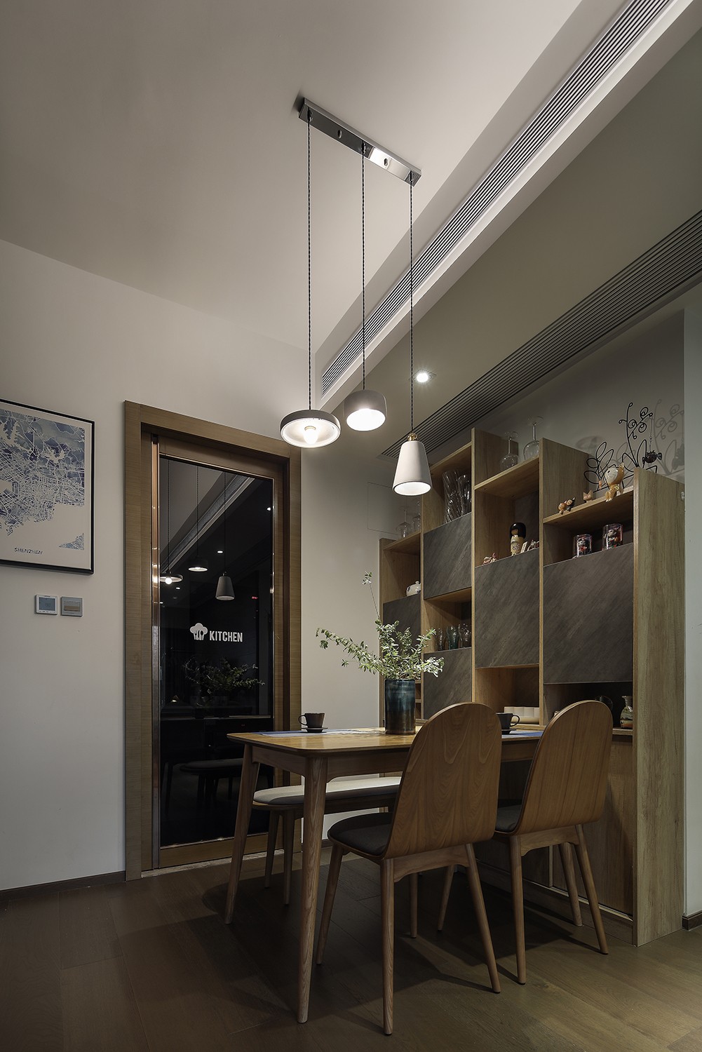 靠墻而立的是風(fēng)格獨(dú)特的錯(cuò)落式木柜,可陳設(shè)酒器、擺放小巧的飾品;靠柜擺放的是簡(jiǎn)約系木質(zhì)長(zhǎng)型餐桌,搭配以餐椅和長(zhǎng)凳結(jié)合的形式,便于收納也節(jié)省了空間;上方是錯(cuò)落有致、造型不一的幾何燈具,設(shè)計(jì)感滿滿!各元素的有機(jī)組合,打破了原有空間的單調(diào),再配上一首舒緩的音樂(lè),好不悠哉!