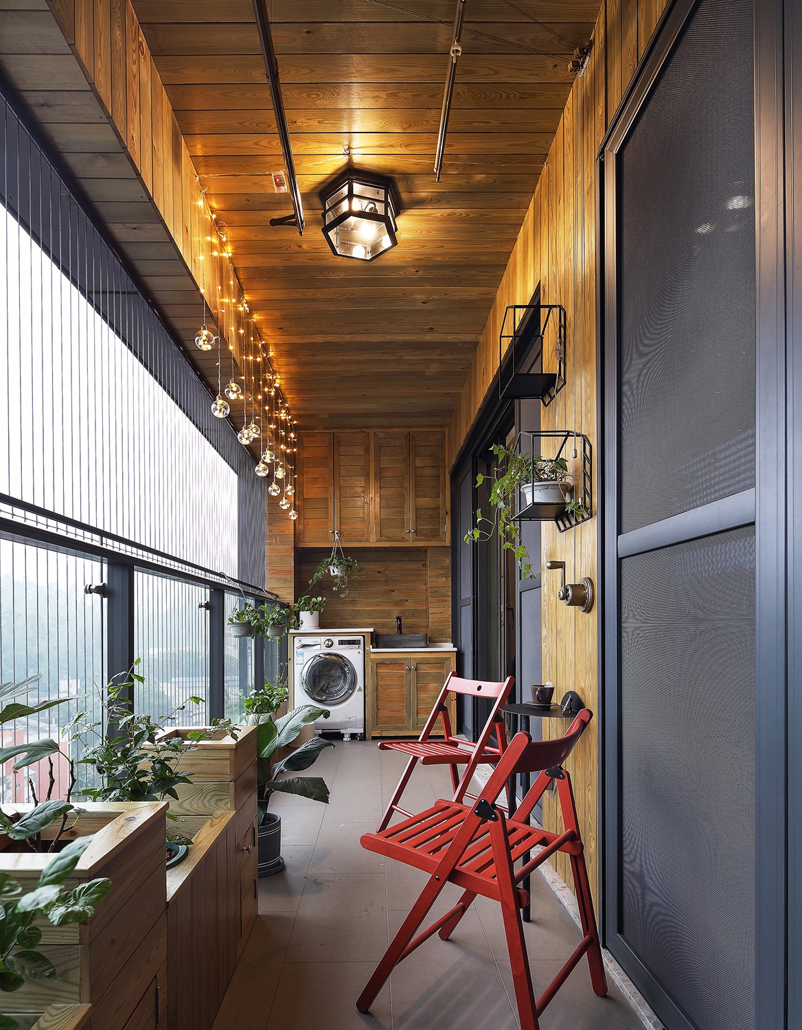 開(kāi)闊的木色陽(yáng)臺(tái)區(qū)域,置入洗衣機(jī),減輕了浴室的空間負(fù)擔(dān)。水晶的吊墜和閃燈增添了墻面的美感,盆栽綠植的放置呈現(xiàn)不經(jīng)意間的雅趣,黑色鐵管的晾衣架搭配燈具,實(shí)用又有設(shè)計(jì)感。