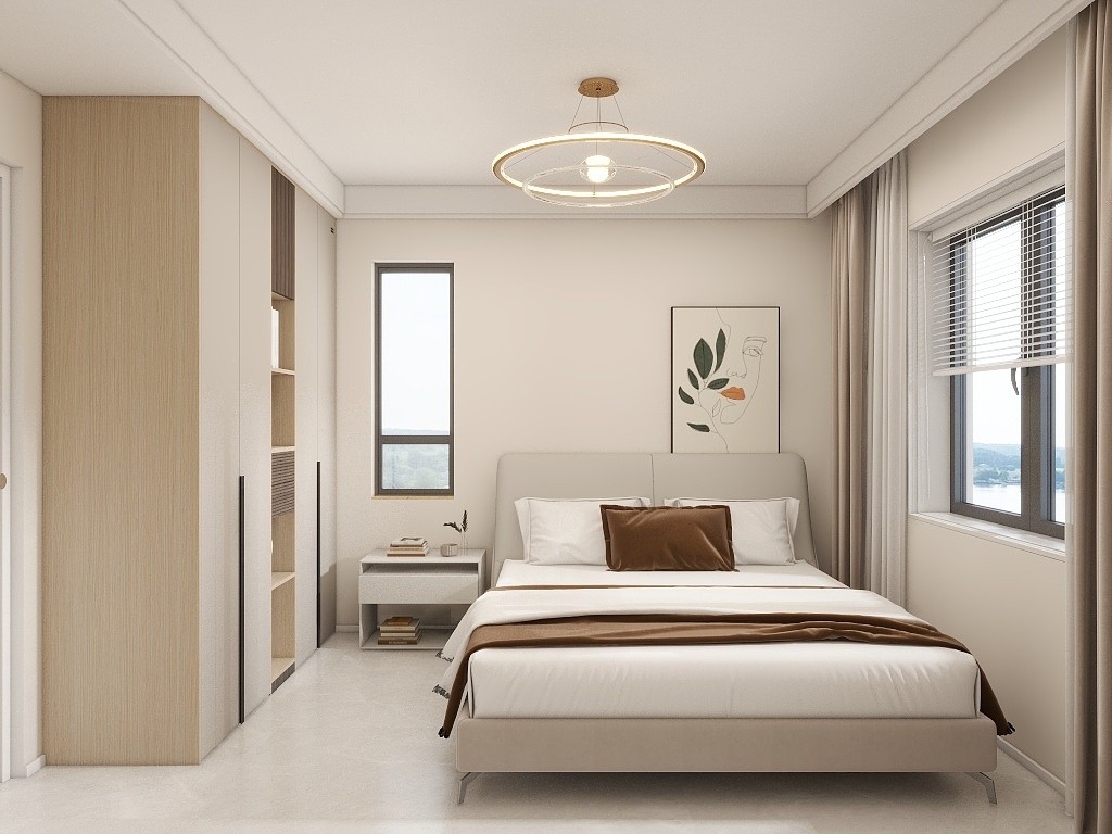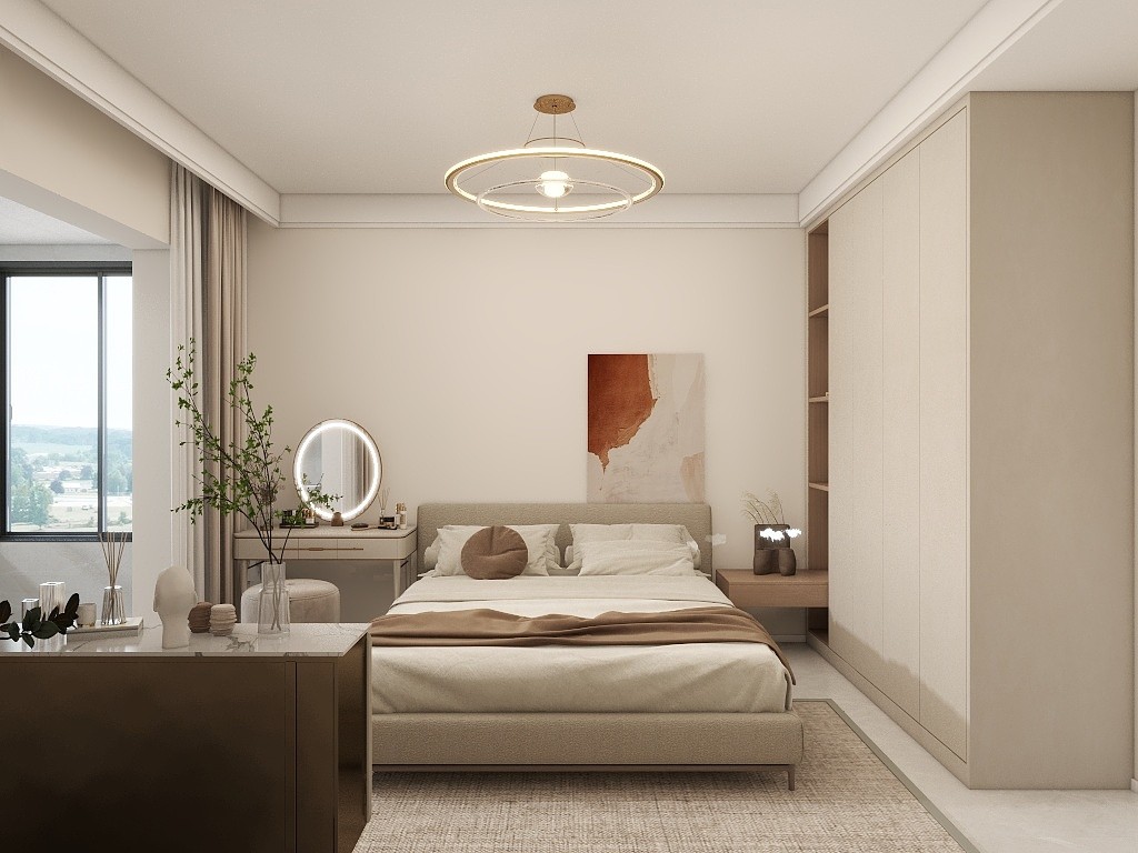 主臥空間全屋定制衣柜帶床頭柜.雙眼皮吊頂整體為暖色系