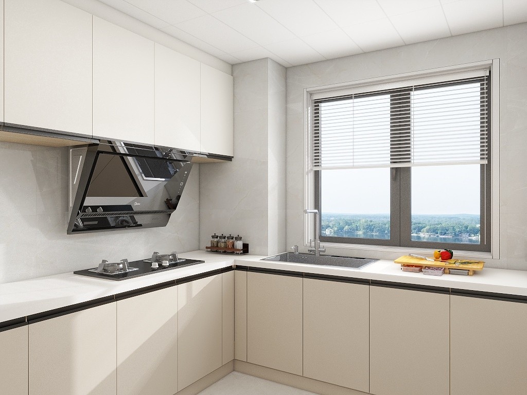 廚房空間櫥柜做跳色處理地柜為奶咖色吊柜為象牙白搭配顯得空間立體感比較強(qiáng)