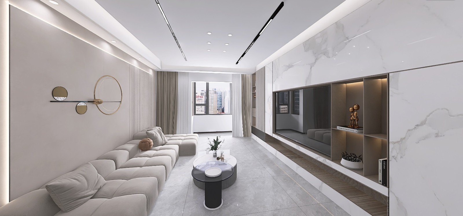 巖板電視背景墻+木飾面沙發(fā)背景墻+無主燈吊頂