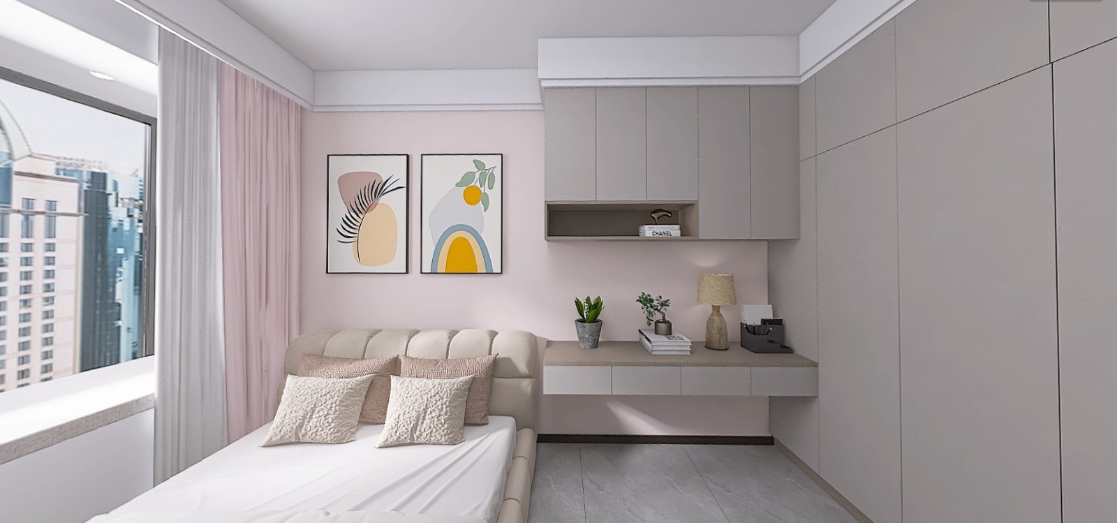 兒童房做了L型轉角書桌 整體墻面刷淡粉色乳膠漆