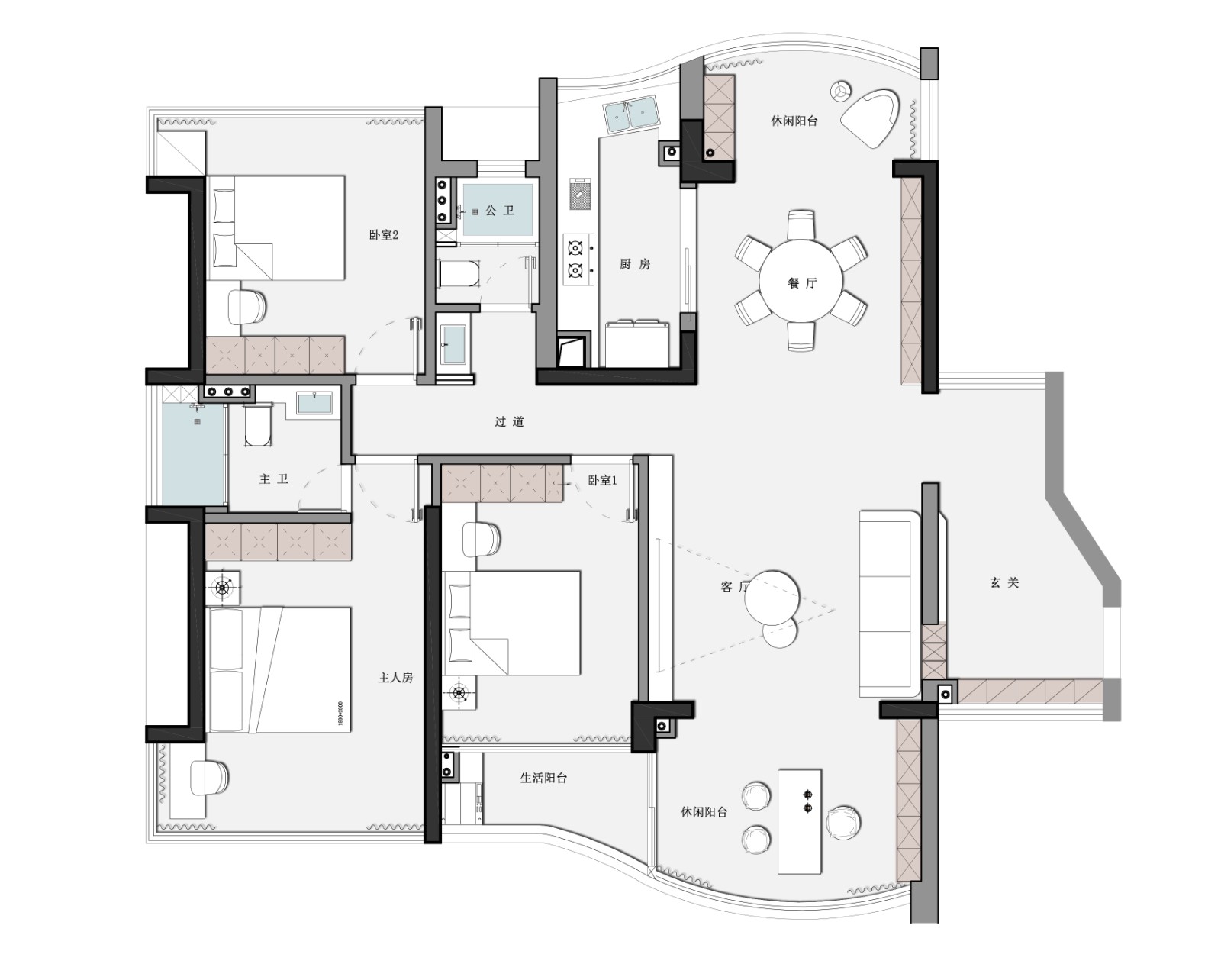 該區(qū)域重點(diǎn)是將客廳擴(kuò)大打通陽臺(tái),把陽臺(tái)一分為二使用,增大客廳公共區(qū)域的空間,同時(shí)也讓原本較長(zhǎng)的陽臺(tái)充分利用上。一邊作為生活陽臺(tái)使用,另一邊做休閑陽臺(tái)。