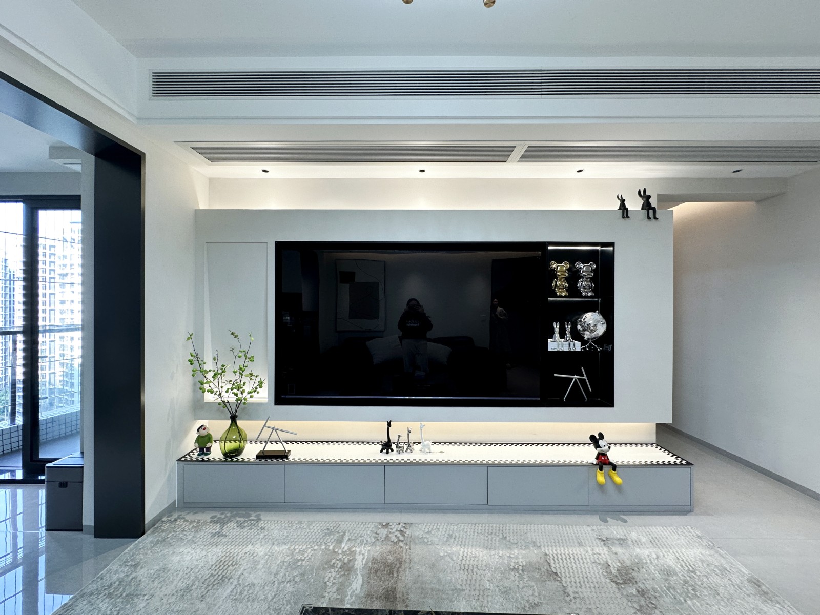 電視墻是整個(gè)客廳的視覺中心,黑色的大屏幕電視嵌在白色的墻體內(nèi),下方的柜子用于放置各類物品,柜子上擺放了一些裝飾品,包括玩偶和擺件等,增添了生活氣息。