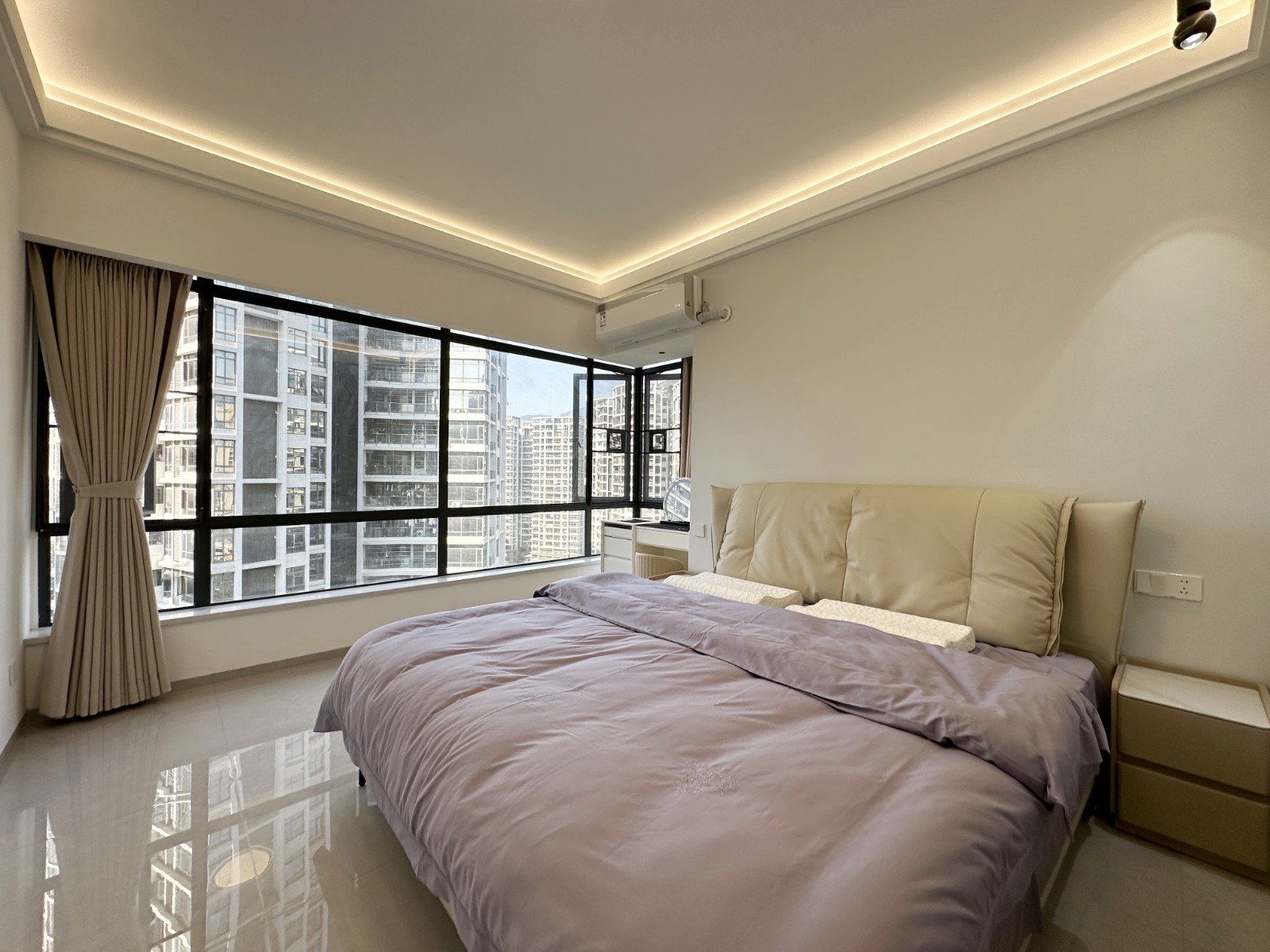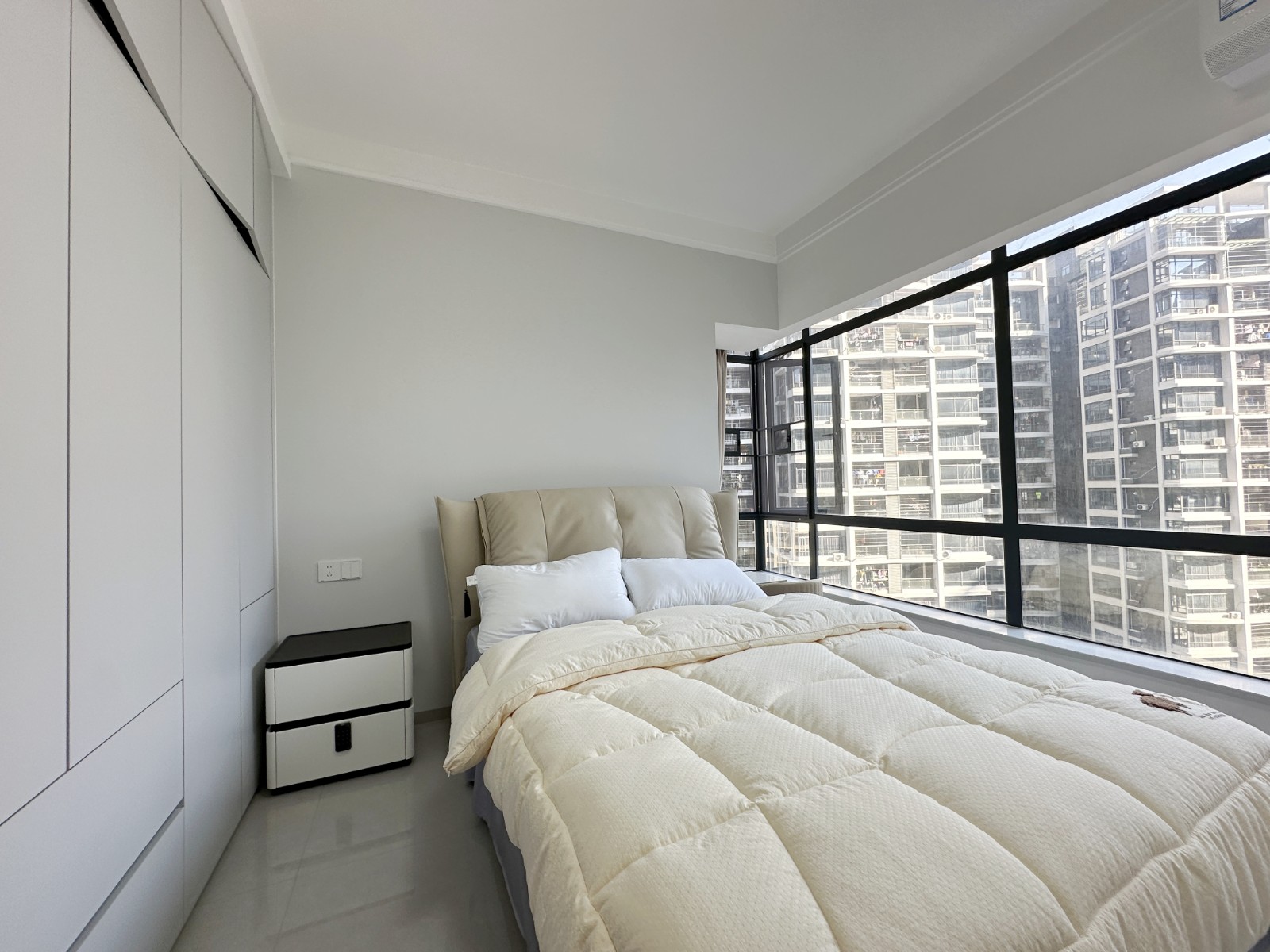 整體色調(diào)以白色和淺灰色為主,營(yíng)造出一種干凈、整潔和寧靜的氛圍。電動(dòng)窗簾+大落地玻璃窗,不僅為房間提供了良好的視野,還增加了房間的現(xiàn)代感。