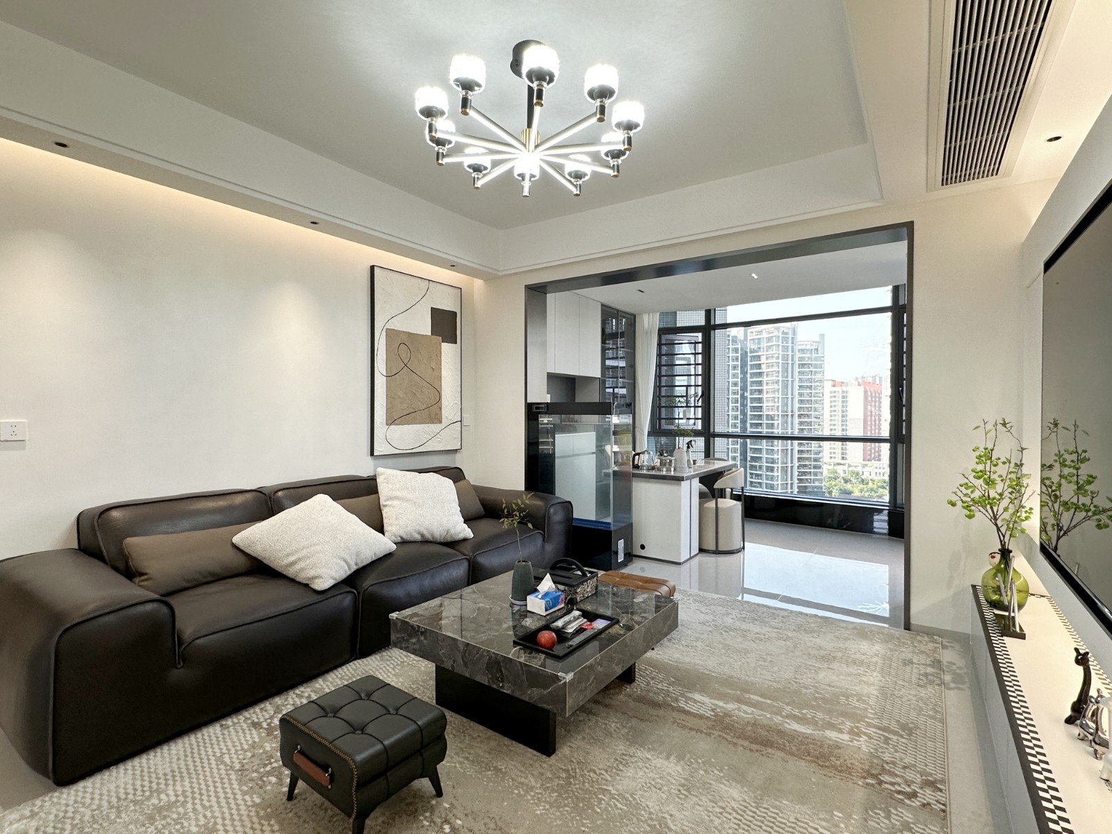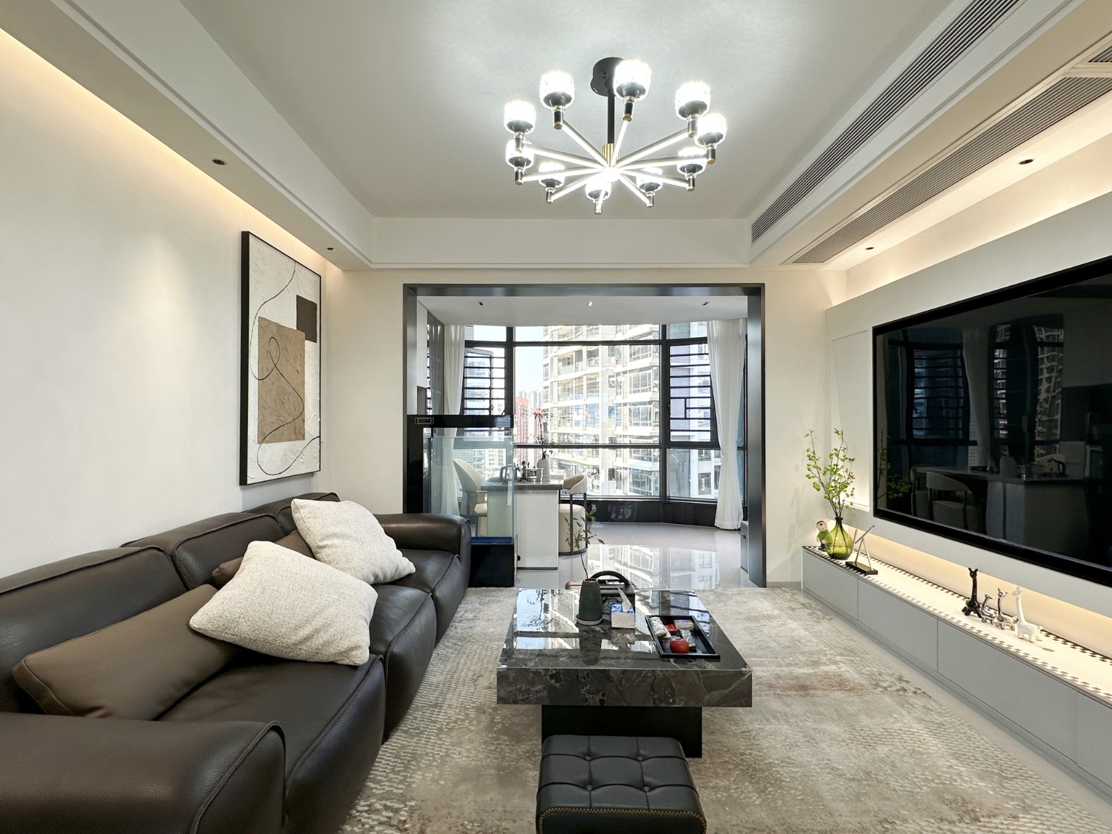 客廳有著諸多現(xiàn)代設(shè)計(jì)元素。客廳的天花板裝有造型別致的吊燈,燈光柔和,為客廳增添了溫馨的氛圍。