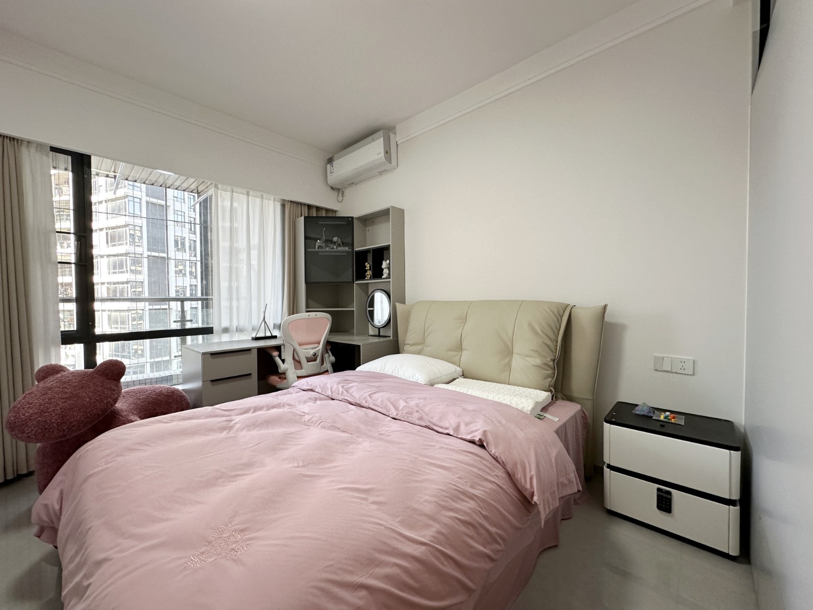 整體明亮整潔,床頭做了淺灰色調(diào),房間有大面積的落地窗,能夠充分利用自然光,使房間顯得明亮和寬敞。