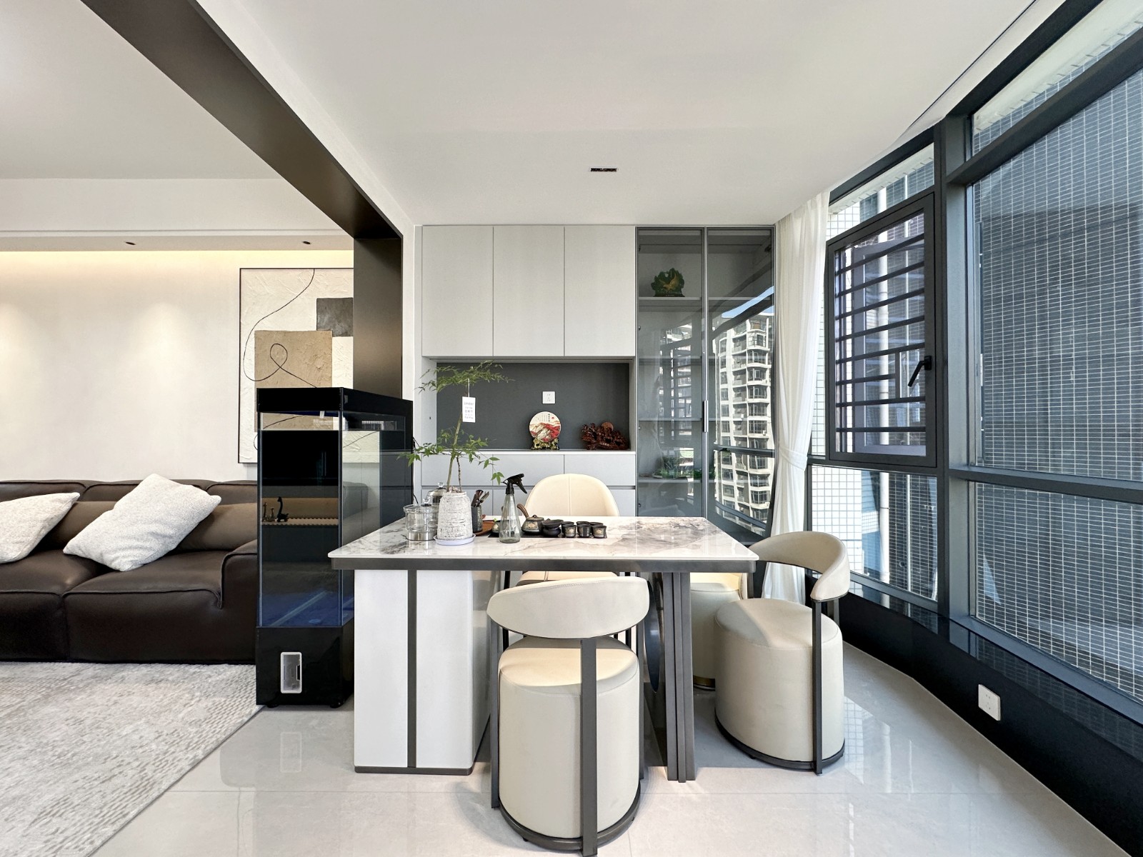 墻面采用了淺灰色的柜體設(shè)計(jì),柜體上擺放了一些裝飾品,包括綠植和擺件等,使空間更具活力。柜體旁邊有一個(gè)黑色的魚缸,里面的水草和魚兒為空間帶來了靈動(dòng)之感。右側(cè)是大面積的落地窗,窗外可以看到城市的高樓景觀,增加了空間的通透感和視覺延展性。地面鋪設(shè)的淺色地毯與整體色調(diào)相協(xié)調(diào),進(jìn)一步強(qiáng)化了現(xiàn)代風(fēng)格。