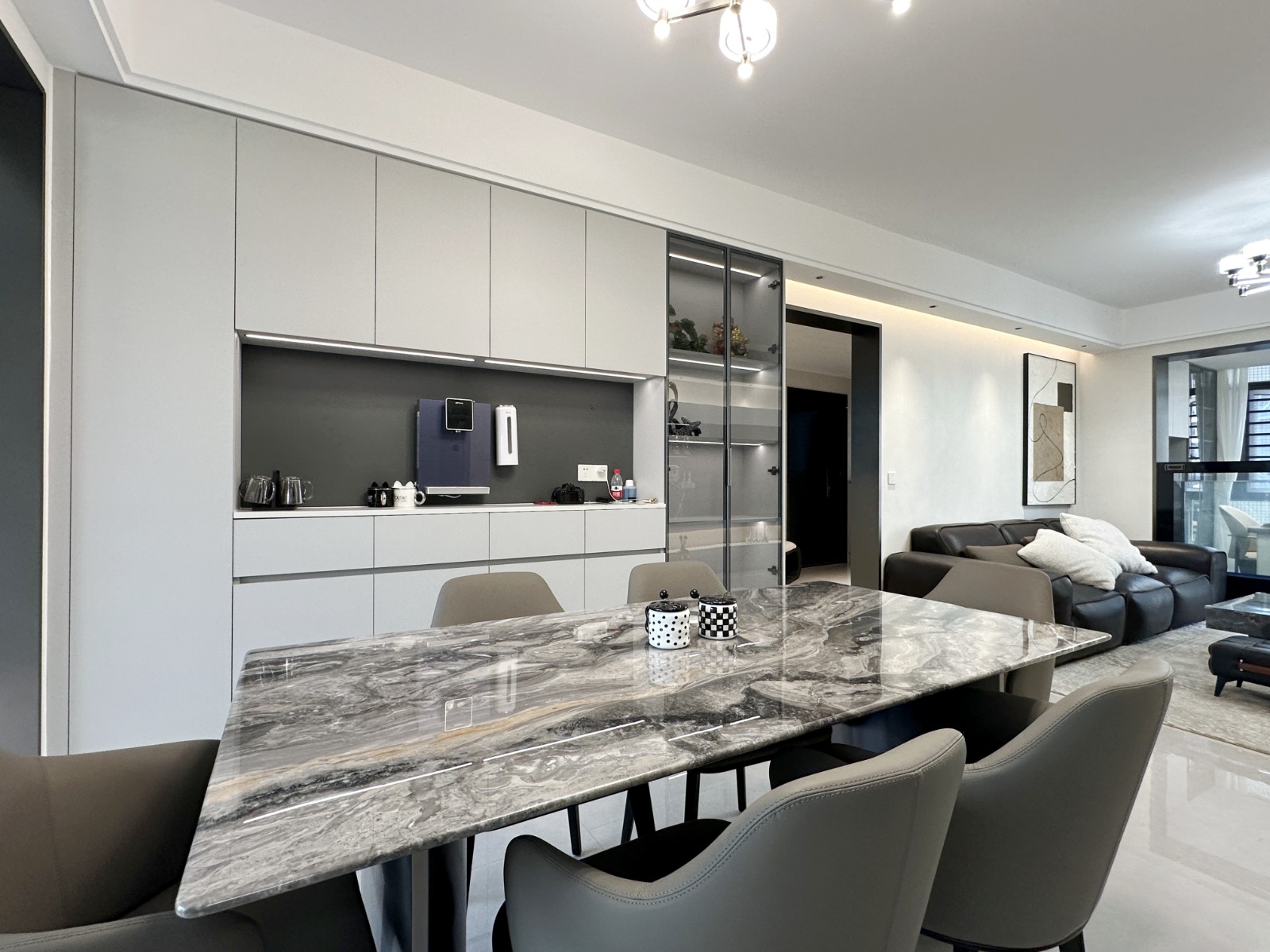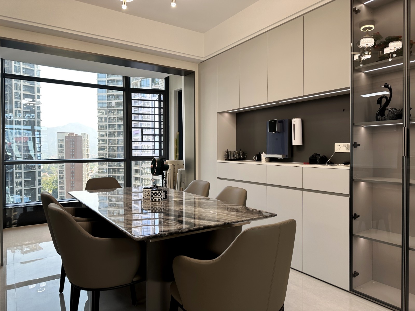 餐廳的核心是一張大理石紋理的餐桌,搭配淺棕色的餐椅,營(yíng)造出一種優(yōu)雅且舒適的用餐氛圍。