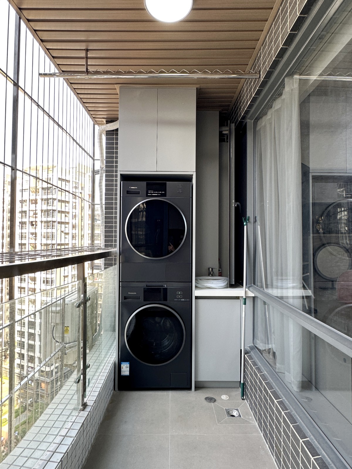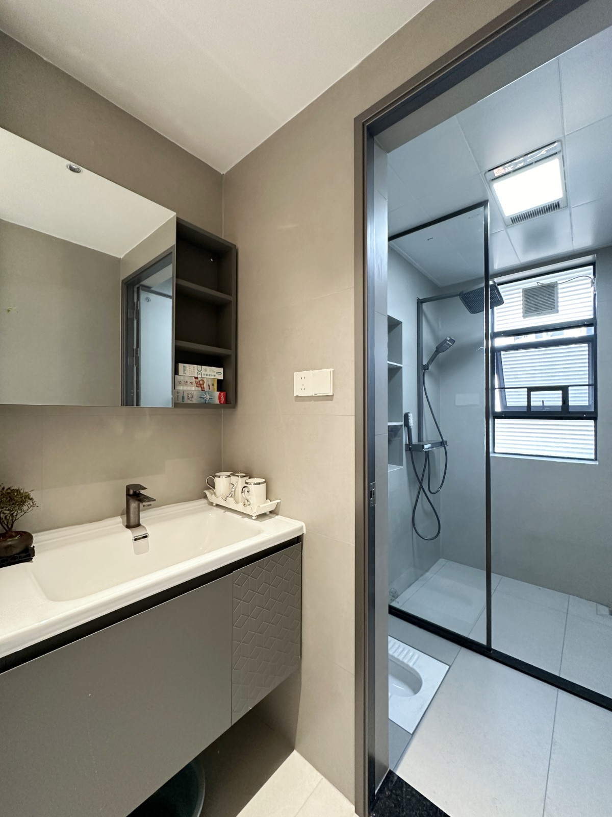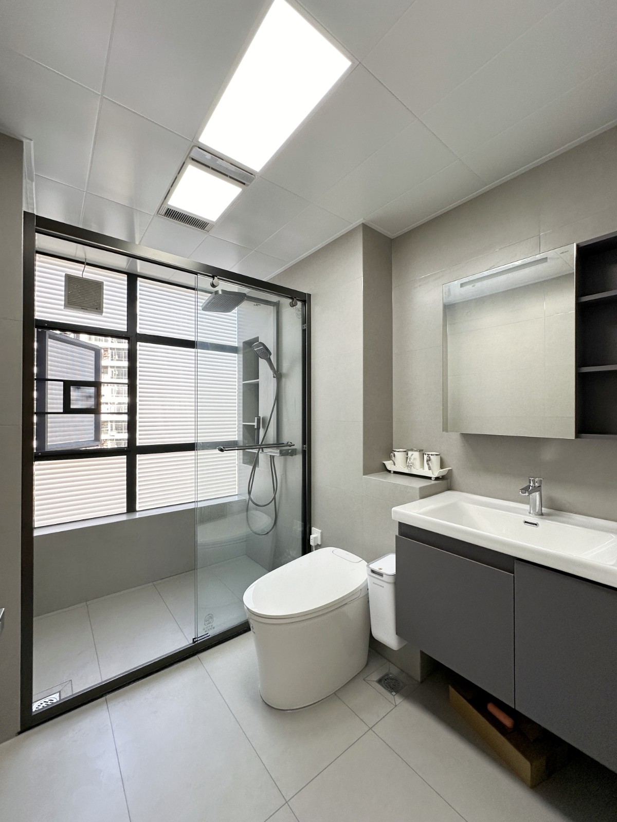 公衛(wèi)空間劃分干區(qū)與濕區(qū)相結(jié)合,延伸過道為一體,用黑色不銹鋼不套點(diǎn)綴,灰色的墻面和白色的衛(wèi)浴設(shè)施形成了鮮明的對(duì)比,使空間顯得明亮且有層次感。 主衛(wèi)干濕分離明確,打掉原來飄窗位置做淋浴濕區(qū),在原有排水管位置增加矮墻,馬桶位置寬裕了,延伸浴室柜位置達(dá)到實(shí)用性更高。